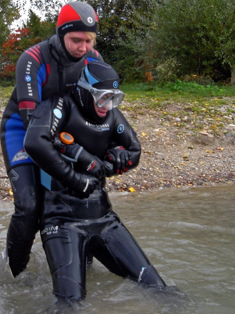 Klaus K. and Susanne W. have extensively practised the abovementioned skill in the pool training sessions, as well as the retrieval of equipment at the water surface and the rescue of victims from the water, followed by first aid. They feel well prepared. In the open water scenario, they have to locate two missing divers, bring them to the surface in a controlled manner, remove equipment and carry out first aid procedures. Filled of enthusiasm, they set off together. The "victims" are soon found – "unconscious" – at about 10m depth. Now, every minute counts. Susanne desperately looks for the "victim’s" inflator hose and inflator-button. The "victim’s" BCD is an Axiom i3 diving jacket and lacks a standard inflator system (It is filled by integrated inlet and outlet valves, in a deflator system). Valuable time passes, and the ascent is anything but "controlled." Klaus brings up his "victim", who is wearing double tanks, to the surface and pulls him quickly to the shore. On the way there, he tries to remove the equipment. He is not familiar with the harness system and fails to notice the crotch strap, losing valuable time as he releases it in shallow water…