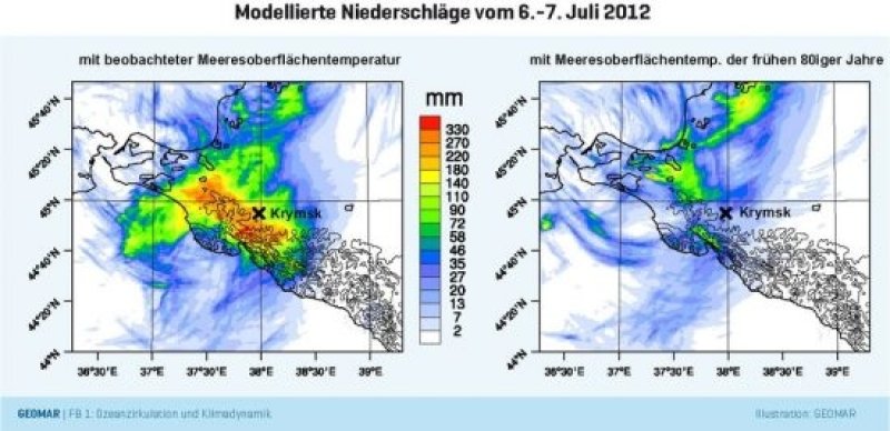 Citing the example of the heavy rains in July 2012 in the Black Sea town of Krymsk (Russia) which led to flash floods that killed 172 people, lead author Edmund Meredith said that the team used "a number of very-high-resolution simulations with an atmospheric model to investigate the impact of rising sea surface temperatures on the formation of intense convective storms, which are often associated with extreme rainfall."