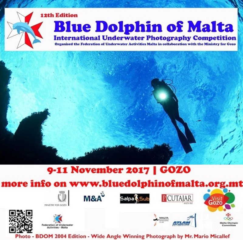 The Blue Dolphin of Malta Underwater Photographic Competition, first held in 1987 will be organised for its 12th Edition in Gozo on the 09-11th November 2017 with the assistance of the Ministry for Gozo. Gozo has been voted as one of the best dive locations in the Mediterranean and even though it will be November, the surface water temperature will still be 20 degrees or more so no need for drysuit! Dive sites like the Blue Hole and the new Azure Reef at Dwejra (Reef formed in march 2017 after the collapse of the Azure Window), the Pinnacle at Ras il-Hobz and the Double Arch at Xwejni are all well loved dive sites and much photographed and worth visting. The competition aims to bring together local and International underwater photographers to compete together for the best set of photos in three categories: • Ambient – Wide Angle Photography • Macro (Non Fish) Photography • Macro (Fish) Photography The competition is further split in two classes to segregate advanced and beginner photographers based on the equipment used and thus enabling participants to pitch their skills amongst photographers of similar experience and using relatively similar levels of equipment. Relative beginners will thus not be discouraged. Dates proposed for foreign participants are between 8th-12th November and programme outline is as follows: • Thursday 9th Technical Meeting 20:00 at the Competition Base in Gozo • Friday 10th Competition dives held one in the morning and another in the afternoon – Dive Sites around Gozo chosen depending on prevailing weather conditions • Saturday 11th Presentation 18:00 at the Competition Base in Gozo Participants are offered a 50% rebate on two nights spent in the hotel chosen by the organising team the 4 Star Hotel Calypso, Marsalforn, Gozo, just a stone’s throw away from the sea. Further information may be found on the event website at www.bluedolphinofmalta.org.mt