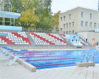 on the territory of the Miras sports complex, in Almetyevsk, Shevchenko St. 55. Pool depth 2.2 m, lane length 50 m, number of lanes 10. Water purification without chlorine.